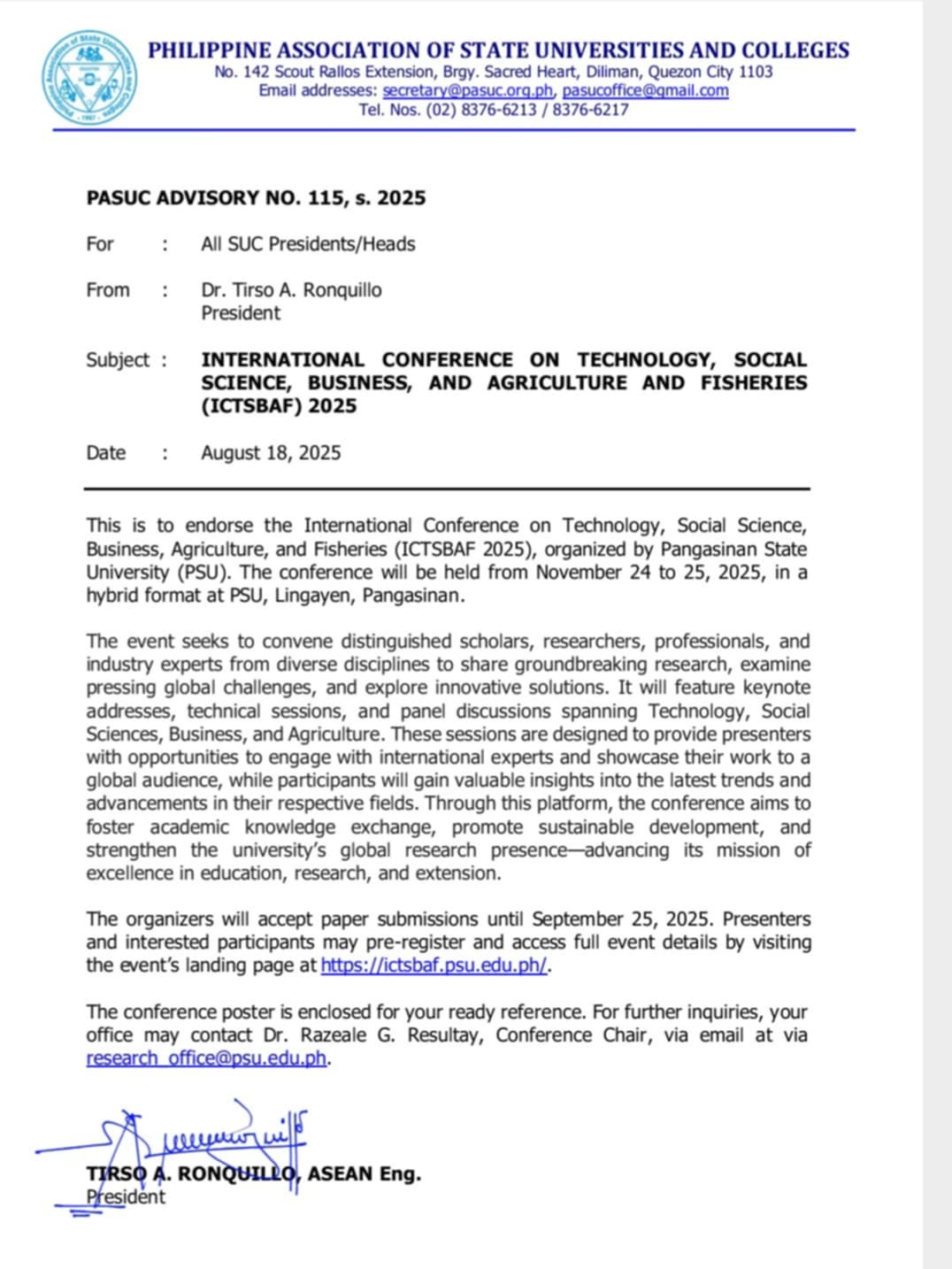 The International Conference on Technology, Social Science, Business, Agriculture, and Fisheries (ICTSBAF 2025) will be held on November 24–25, 2025(online and onsite), at the PSU Golden Lion Hotel, Lingayen, Pangasinan, Philippines. Organized by Pangasinan State University, the conference is being conducted in collaboration with the Commission on Higher Education Region 1 (CHED R1), Caraga State University, and Thu Duc College of Technology in Vietnam, together with its partner institutions and organizations, namely Aklan State University, City College of Calamba, Kalinga State University, Marikina Polytechnic College, Northern Iloilo State University, Pampanga State University, Pangasinan Polytechnic College, Quirino State University, Universidad de Dagupan, University of Antique, University of Eastern Pangasinan, Urdaneta City University, World City College, Siquijor State College, Baguio Central University and the Quantum Computing Society of the Philippines.